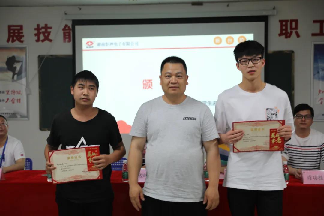 郴州技師學院實習帶隊老師陳穩生、廖宇、周宇,企業代表人事部唐俊峰、肖功桂及100余名實習生參與了本次表彰。
